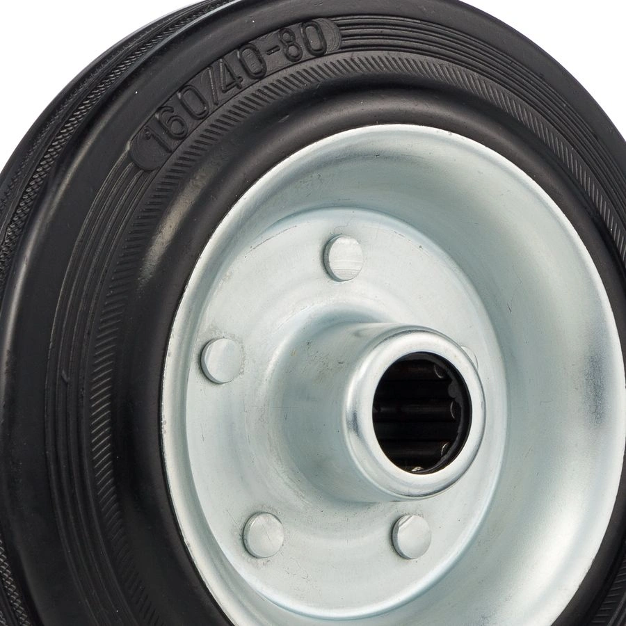 Колесо из черной резины 4000-160, диаметр 160мм.,под ось 20мм. Колесо из черной литой резины. Центр из стального оцинкованного обода из штампованной стали. В оси колес роликовый подшипник. Колеса из черной резины, центр из двух гальванизированных дисков из штампованной стали. Роликовый (игольчатый) подшипник расположен в углублении, выдавленном под прессом, и содержит цилиндрические ролики подшипника. Возможно применение на относительно грубых полах складов, заводов, производственных и строительных площадках. Данные колеса можно использовать на неровных поверхностях, во влажной окружающей среде и использовании вне помещения, не рекомендуется применять в среде с органическими растворителями, хлорированными веществами, гидрокарбонатами и минеральными маслами. Температура эксплуатации от -20 до +70С.