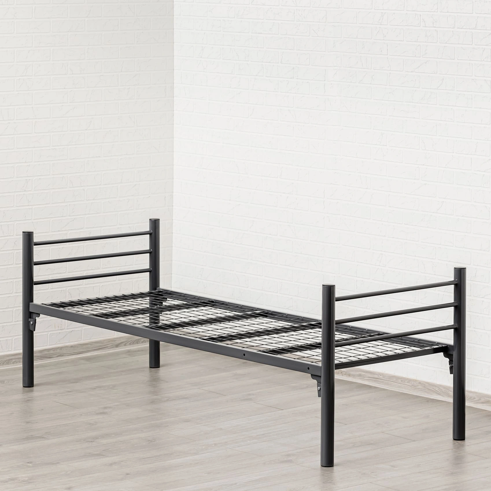 Спинки кровати выполнены в виде двух вертикальных колонок из круглых труб, диаметром Ø51 мм. и объединяющих их, трёх стяжек горизонтальных из труб круглого сечения Ø20 мм. Колонки объединены сваркой. Спинки в сборе имеют "П" - образную форму. Ложе (Рама) - прямоугольной формы, состоит из двух несущих, горизонтальных прямоугольных труб 40х20 мм. и соединяющих их, приваренных - пяти усилителей поперечных из квадратных труб сечением 25х25 мм. Сверху, к несущим трубам и усилителям поперечным приварена сетка сварная металлическая 700х1900 мм. с ячейкой 50*100 мм. и диаметром проволоки Ø3 мм. Ложе и спинки жестко соединяются между собой при сборке, с помощью клиновых зацеплений (Клин+Петля) расположенных на раме и спинках, и изготовленных методом холодной штамповки из листовой стали. Клиновые соединения фиксируется винтами М6х16, шайбами 6 и гайками М6. Открытые крепёжные отв. Ø8 мм., торцы труб спинок и лестницы закрыты пластиковыми заглушками, предохраняющими покрытие пола от повреждений и в декоративных целях. Кровать имеет защитно-декоративное покрытие, стойкое к загрязнению и механическим повреждениям, выполненное порошковыми эпокси-полиэфирными красками в электростатическом поле. Покрытие обладает длительным сроком эксплуатации и является экологически чистым, соответствует ГОСТ 9.410-88. Цвет покрытия - по шкале RAL. Кровать поставляется в защитной упаковке, в разобранном виде. Соответствует нормативным требованиям и ГОСТ 19917-2014.
