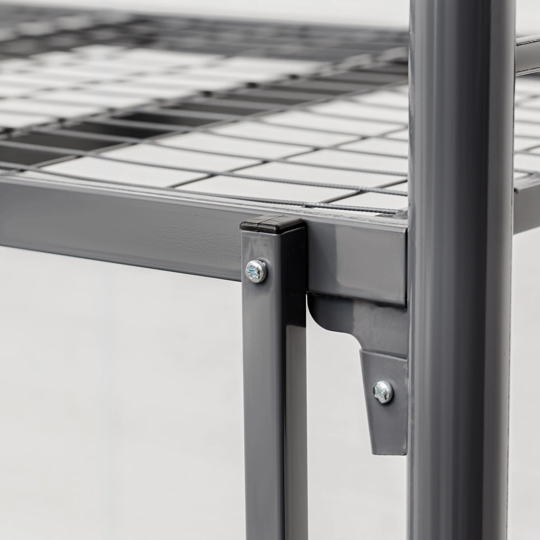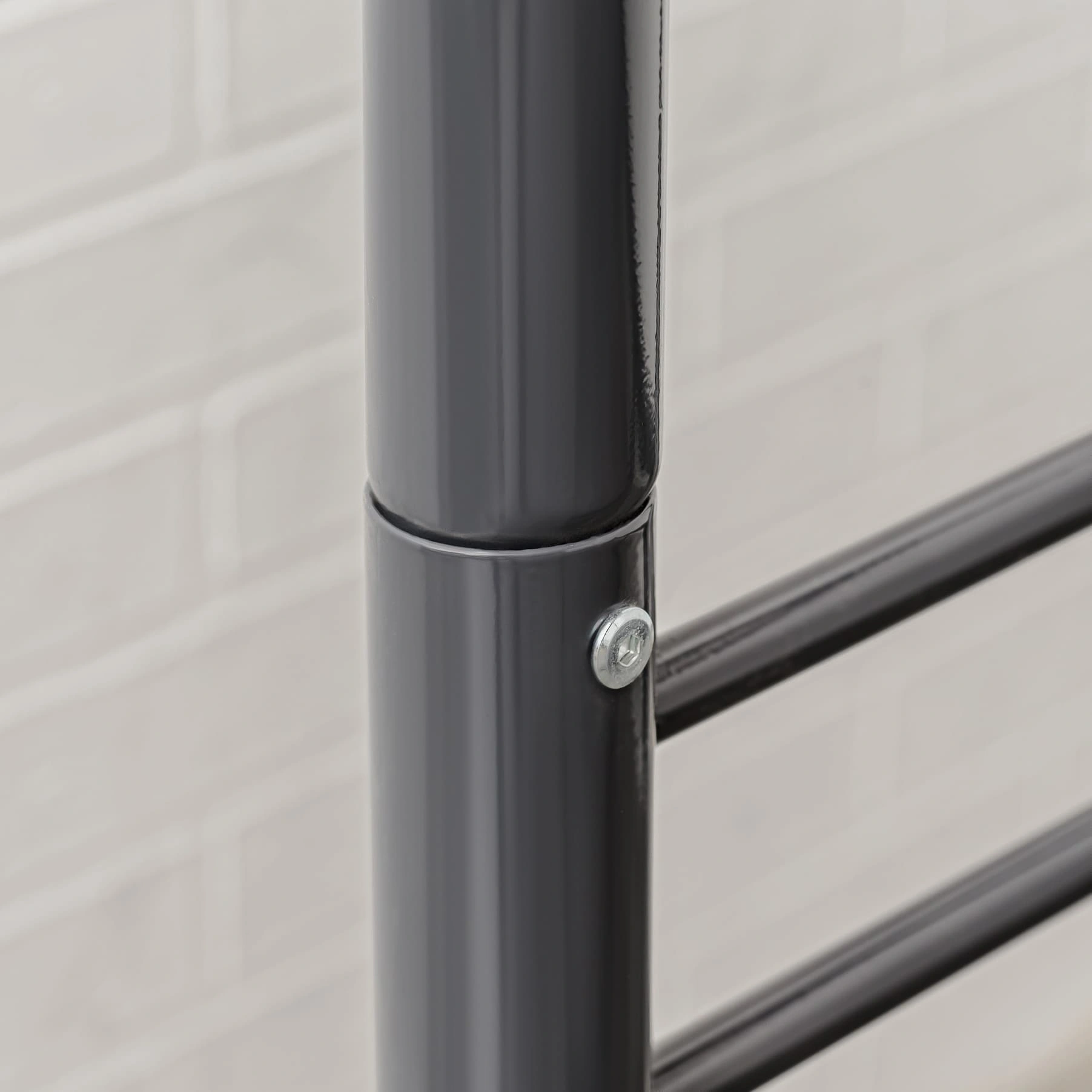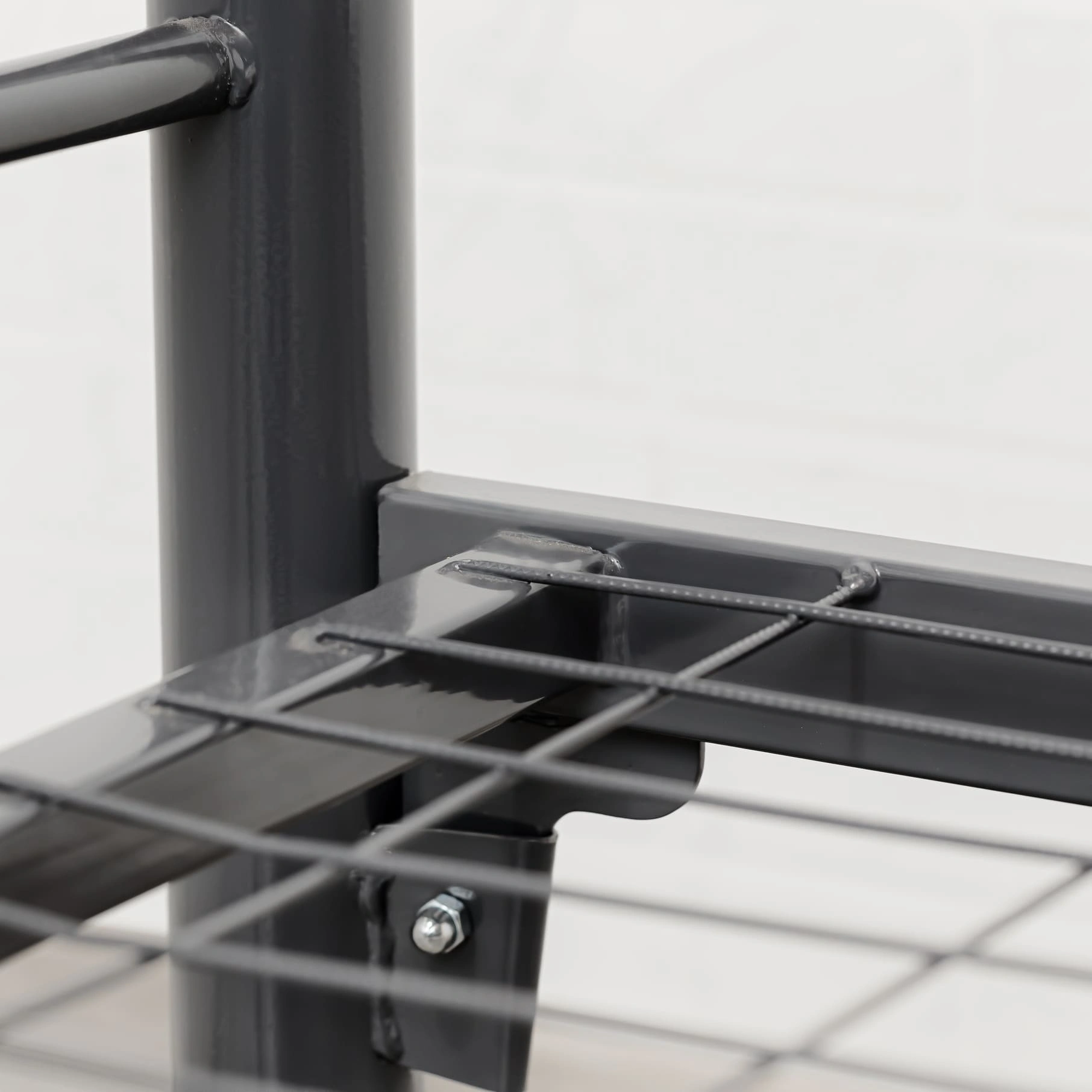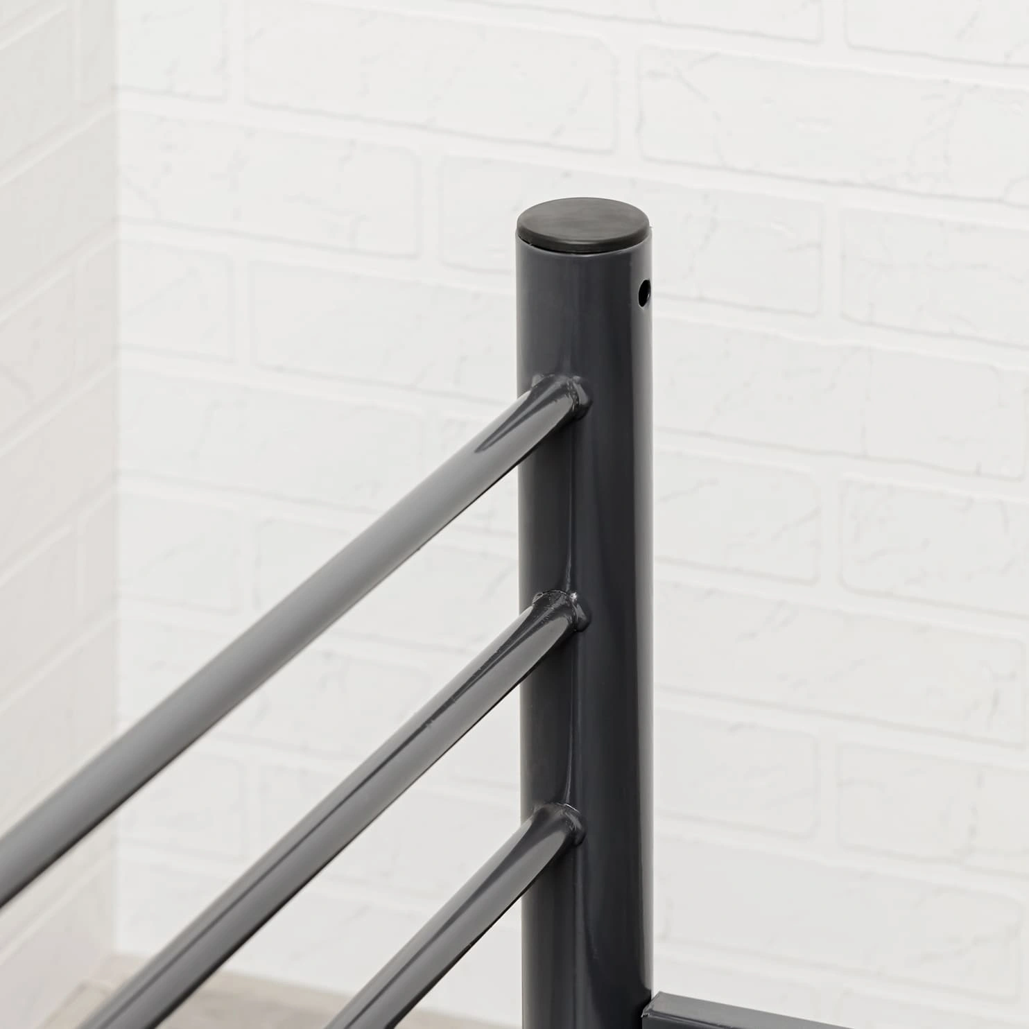 Спинки кровати выполнены в виде двух вертикальных колонок из круглых труб, диаметром Ø51 мм. и объединяющих их, трёх стяжек горизонтальных из труб круглого сечения Ø20 мм. Колонки объединены сваркой. Колонки спинок верхних (с отв. под крепление ограждения), одеты на колонки спинок нижних с помощью переходников. Спинки фиксируются Винтами М6х16 мм. Спинки в сборе имеют "П" - образную форму. Ложе (Рама) - прямоугольной формы, состоит из двух несущих, горизонтальных прямоугольных труб 40х20 мм. и соединяющих их, приваренных - пяти усилителей поперечных из квадратных труб сечением 25х25 мм. Сверху, к несущим трубам и усилителям поперечным приварена сетка сварная металлическая 700х1900 мм. с ячейкой 50*100 мм. и диаметром проволоки Ø3 мм. Ложе и Спинки жестко соединяются между собой при сборке, с помощью клиновых зацеплений (Клин+Петля) расположенных на раме и спинках, и изготовленных методом холодной штамповки из листовой стали. Клиновые соединения фиксируется винтами М6х16, шайбами 6 и гайками М6. Навесная лестница с тремя ступенями, изготовлена из квадратной трубы 25х25 мм. винтами М6х45 мм. и гайками мебельными М6, лестница жестко крепится к несущим трубам на рамах. На второй ярус устанавливаются ограждения - лицевое 270х1500 и заднее 270х1900 мм., изготовленные из круглой трубы Ø20 мм. с помощью винтов М6х70 мм., каждое из ограждений жестко крепится к несущим горизонтальным прямоугольным трубам рамы и спинкам. Открытые крепёжные отв. Ø8 мм., торцы труб спинок и лестницы закрыты пластиковыми заглушками, предохраняющими покрытие пола от повреждений и в декоративных целях. Кровать имеет защитно-декоративное покрытие, стойкое к загрязнению и механическим повреждениям, выполненное порошковыми эпокси-полиэфирными красками в электростатическом поле. Покрытие обладает длительным сроком эксплуатации и является экологически чистым, соответствует ГОСТ 9.410-88. Цвет покрытия - по шкале RAL. Кровать поставляется в защитной упаковке, в разобранном виде. Соответствует нормативным требованиям и ГОСТ 19917-2014.
